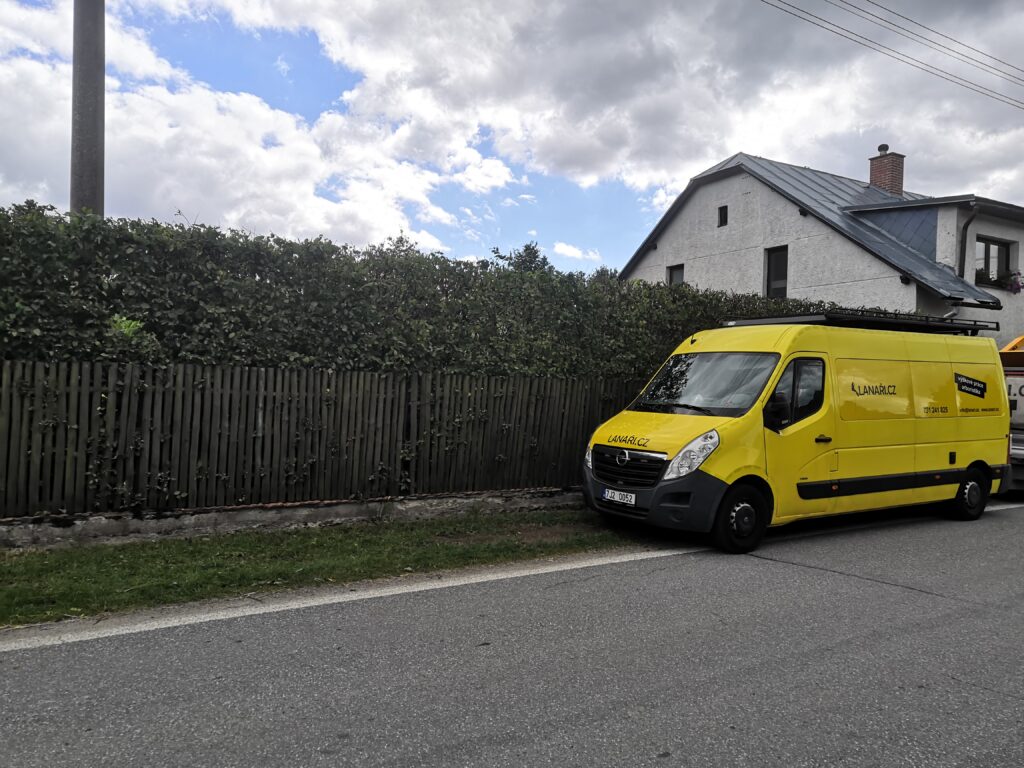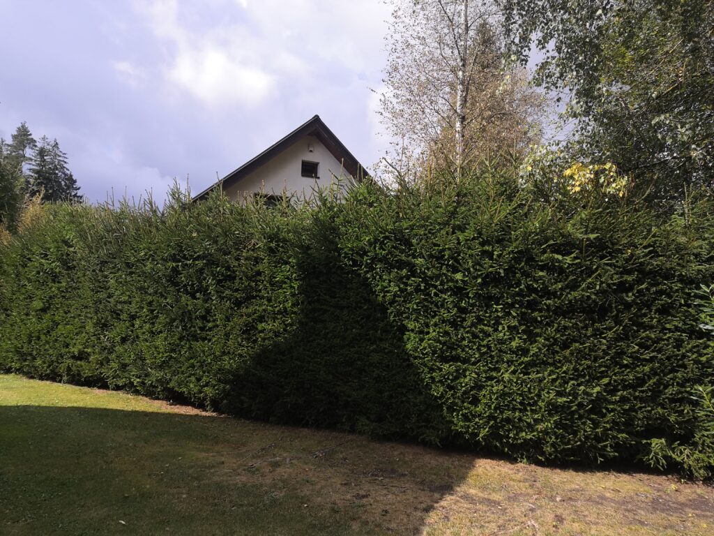Tvarování živého plotu v obci Světnov. Plot je ze smrku, proto je důležité řez provádět pravidelně. Tato dřevina neumí obrazit ze starého dřevo a případné vzniklé odrosty už nejdou opravit.