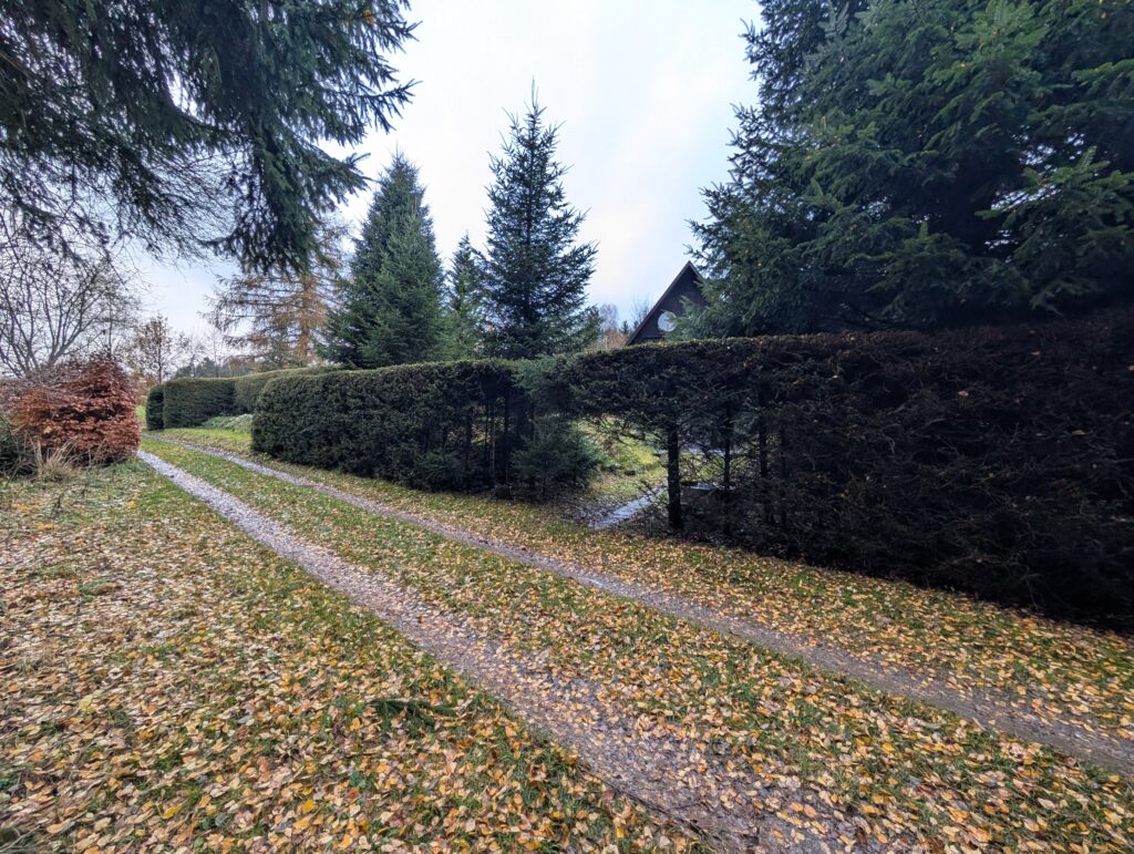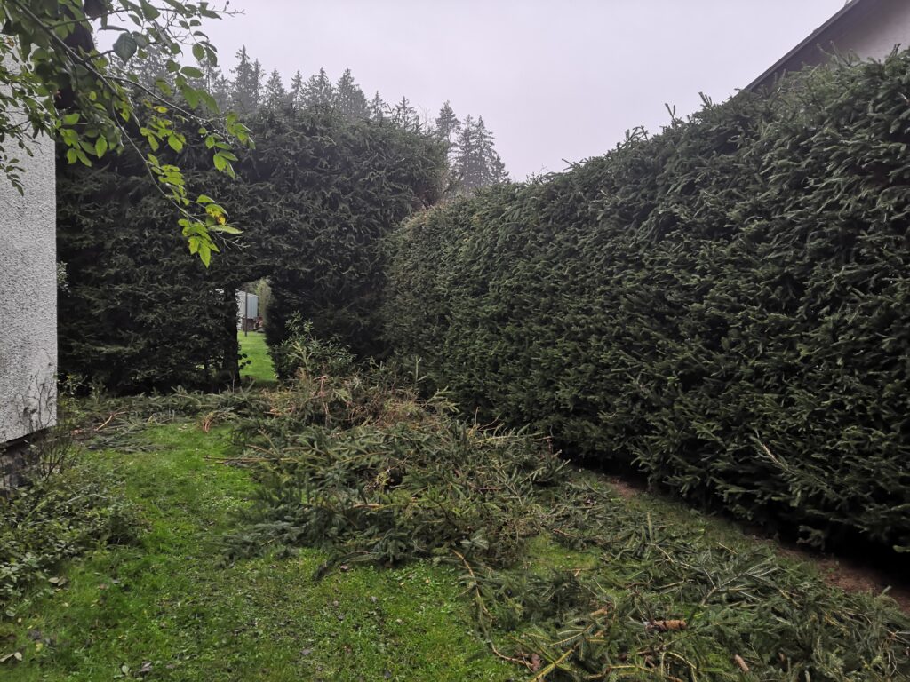 Údržba živého plotu v chatové osadě Dářko nedaleko Žďáru nad Sázavou, respektive Škrdlovic. Smrkový plot byl již hodně přerostlý. Proběhlo jeho snížení za pomoci motorových pil a následné tvarování boků plotostřihem. Větve byly poštěpkovány a štěpka použita k mulčování.