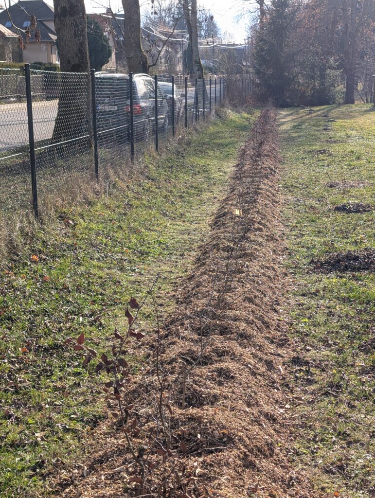 Založení živého plotu z habru v obci Sněžné. Jako dřevina byl vybrán habr nejen z důvodu údržby ale i z důvodu vhodnosti do dané lokality. V následujících letech bude probíhat intenzivní řez aby došlo ke správnému zapěstování a co nejdříve se docílilo zelené stěny. K zamulčování byla použita štěpka z ořezů okolních stromů.