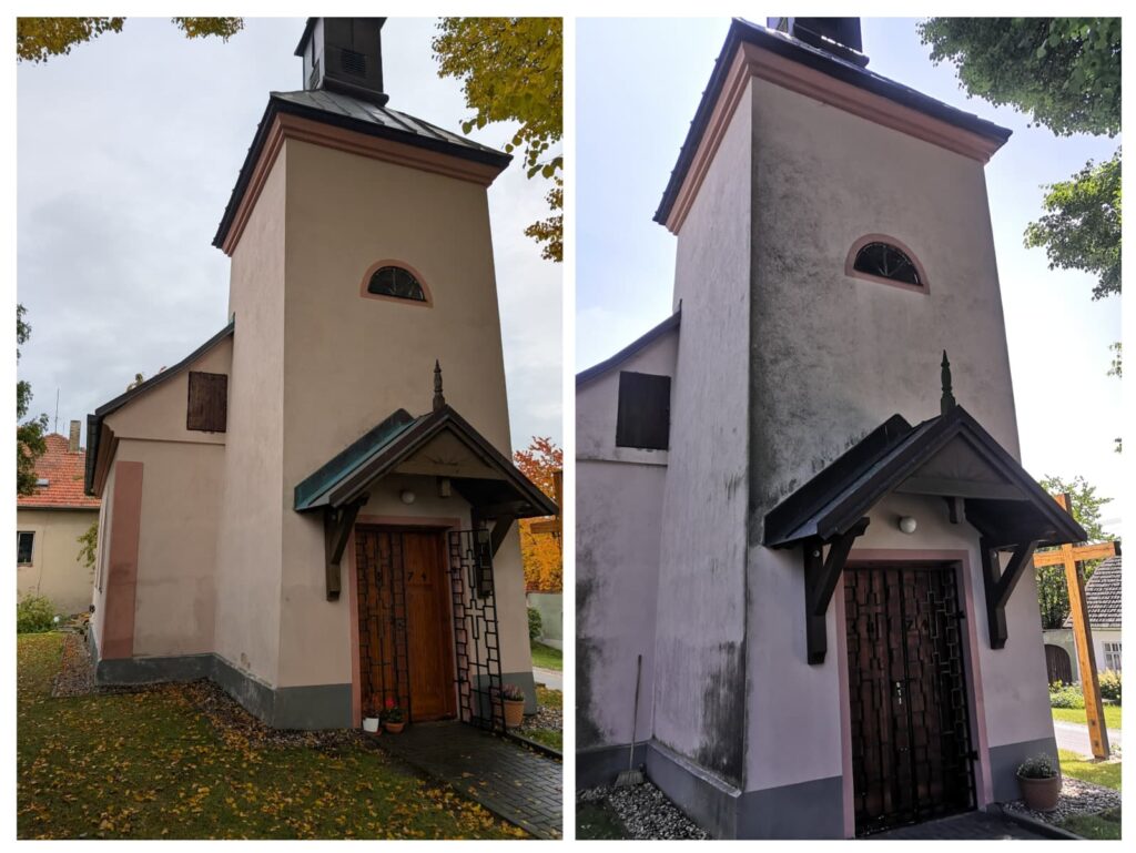 Publikováno 29.1.202629.1.2026 Od adminČištění fasády kapličky Znetínek Čištění fasády kapličky v obci Znetínek. Fasáda byla znečištěná biofilmem. K jeho odstranění byl aplikován postřikv kombinaci s mytím vysokotlakým čističem. Ošetření keramickou ochranou proběhne až dorbných opravách zdiva.