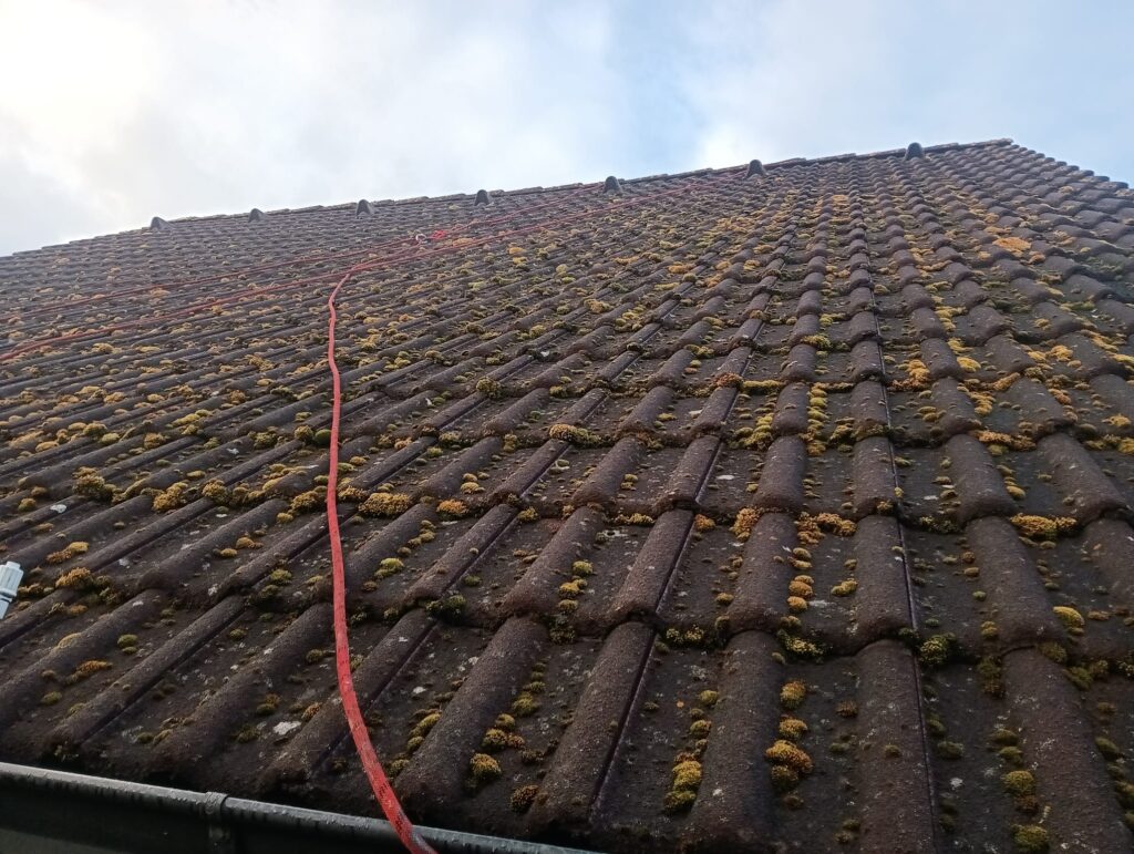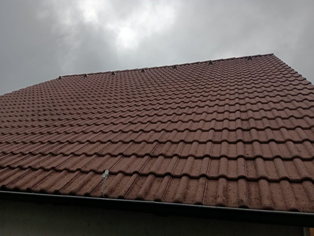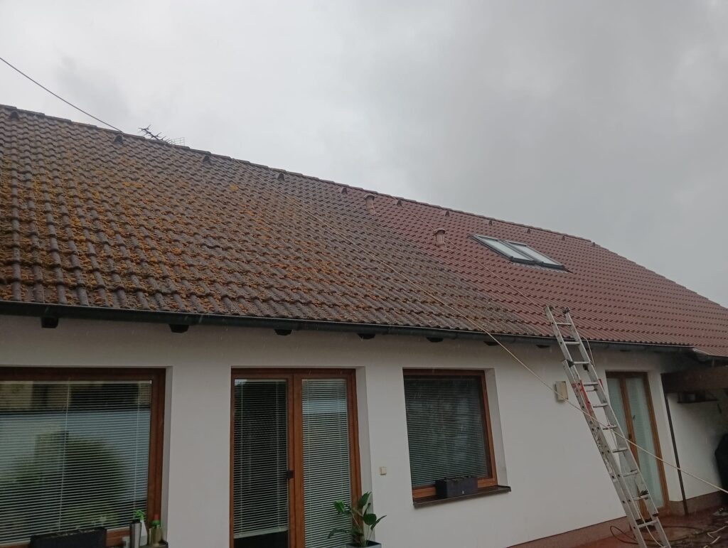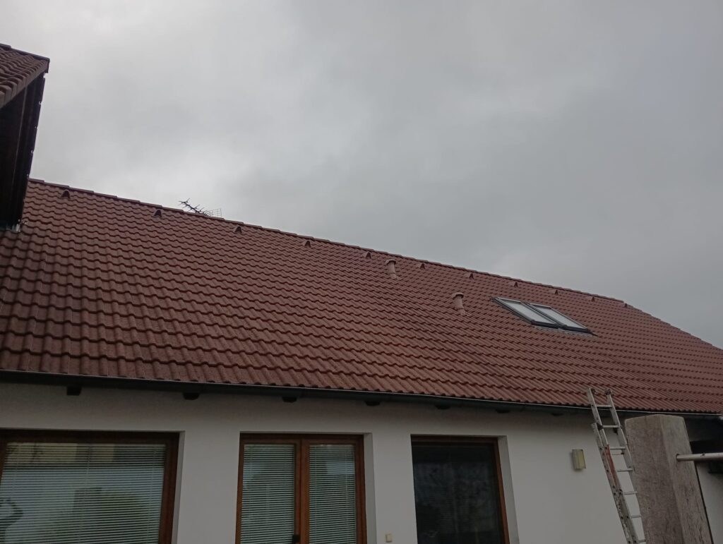 Čištění taškové střechy nedaleko Žďáru nad Sázavou. Na střeše byly řasy, mechy a lišejníky. Povrch byl nejprve ošetřen postřikem proti bio znečištění. Následně proběhlo mytí vysokotlakým čističem. V posledním kroku byla na střechu aplikována keramická ochrana. Ta celý povrch uzavře před vniknutím vody a drobných nečistot. Výsledný efekt čisté střechy tak vydrží mnohem déle než při pouhém vysokotlakém mytí.