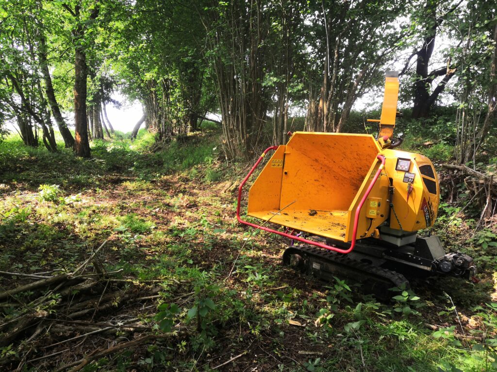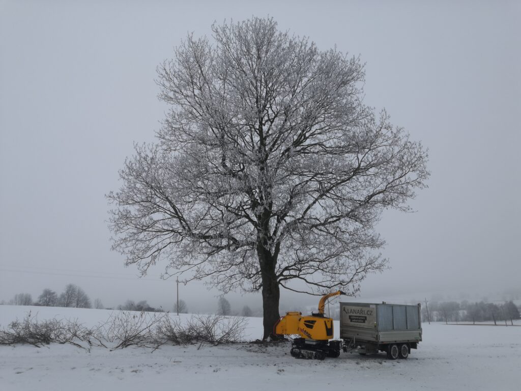 Štěpkování kolem polních cest. Po vyřezání náletů a nevhodných větví je štěpkování pásovým štěpkovačem vhodná volba. Stroj na pásech minimálně poškozuje cestu, dostane se do míst, kam kolový – vlečný štěpkovač ne. Materiál byl použit ke zpětnému zamulčování, případně odvezen na deponii.